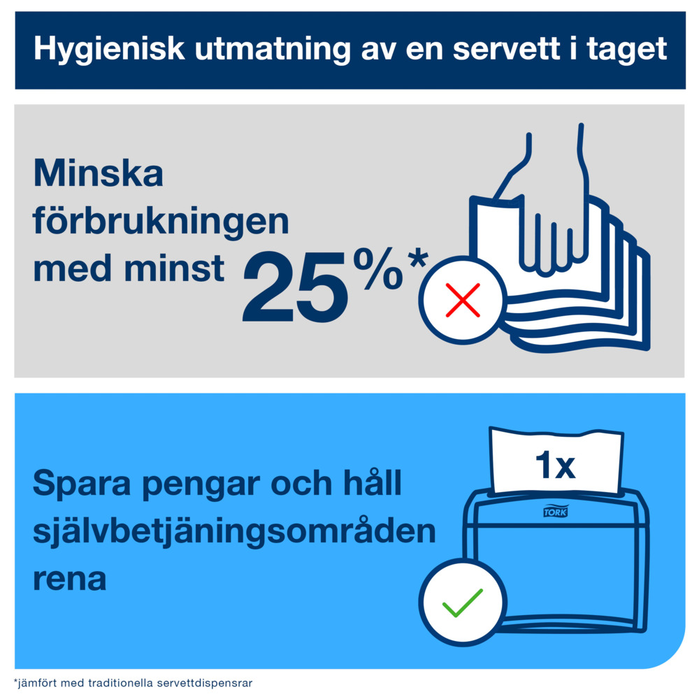 Utmatningen av ett ark i taget minskar förbrukningen med minst 25 % jämfört med traditionella servettdispensrar.
