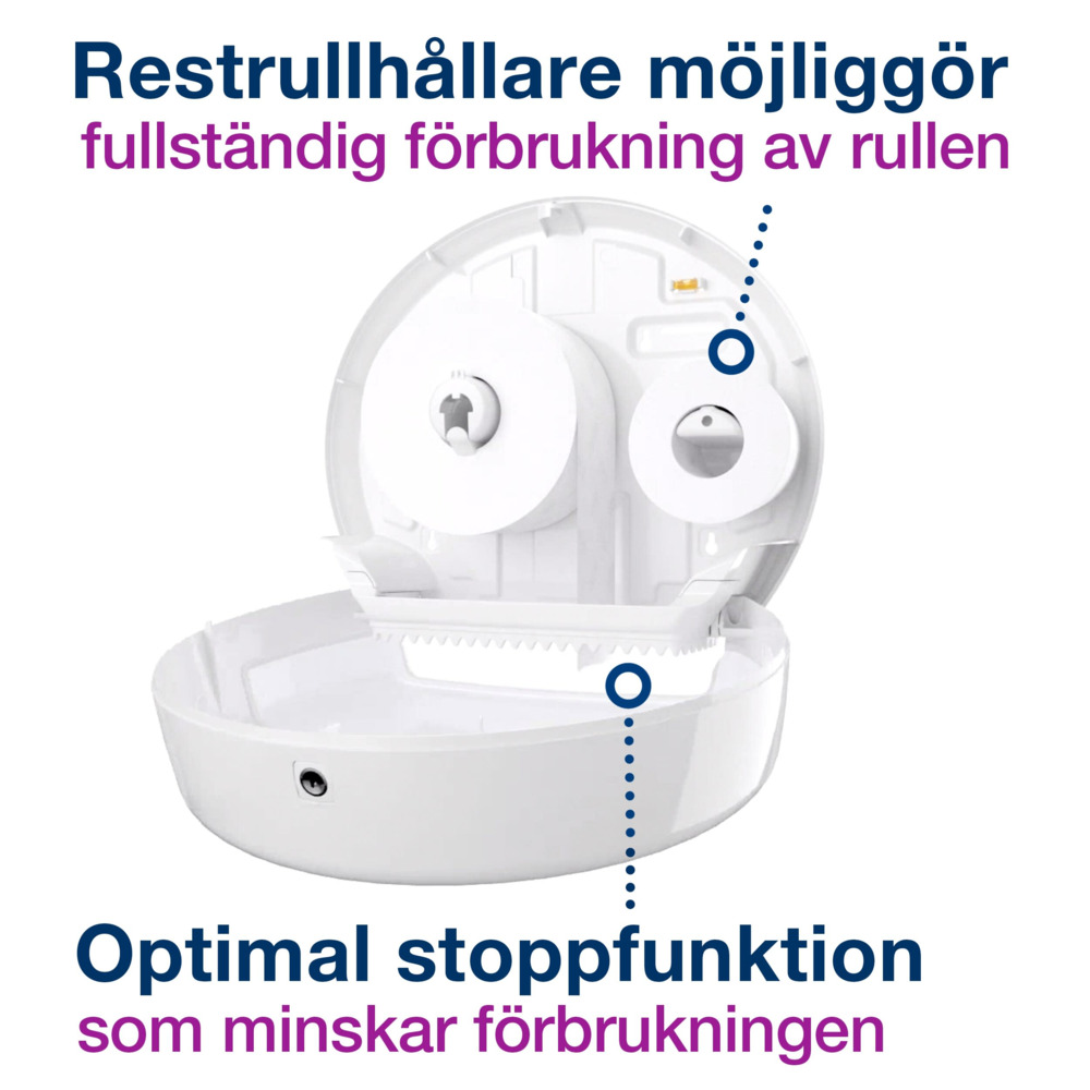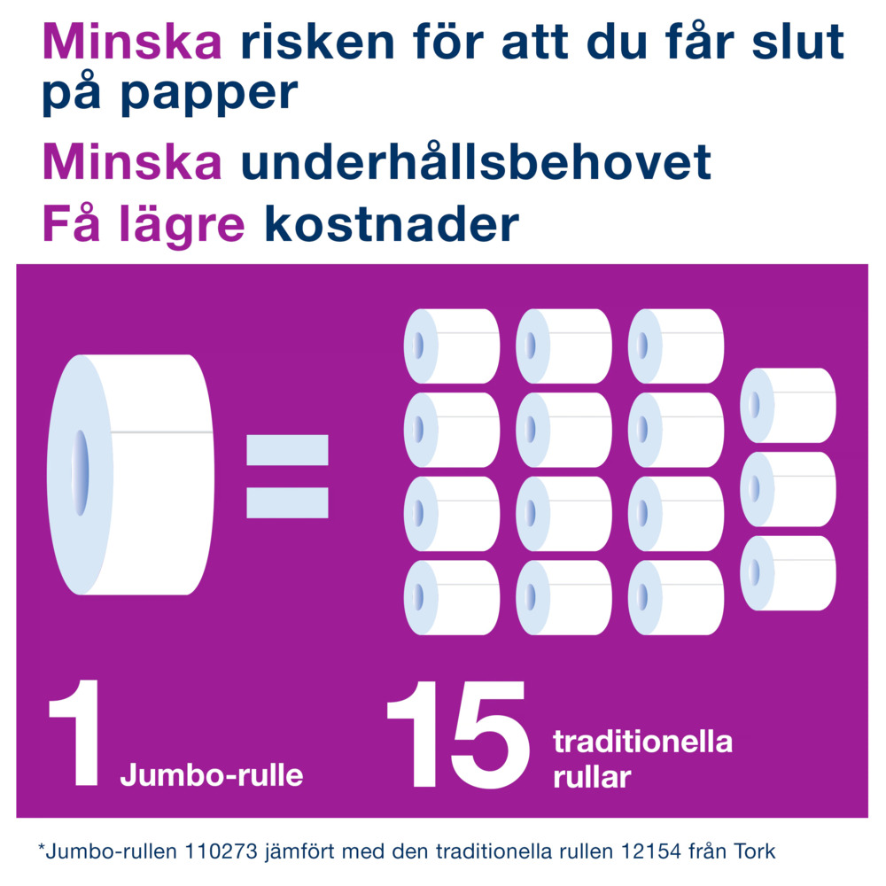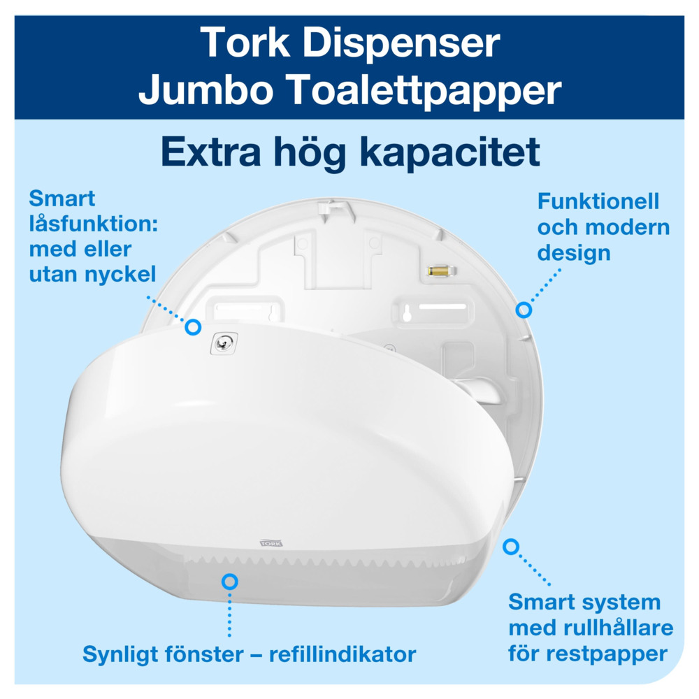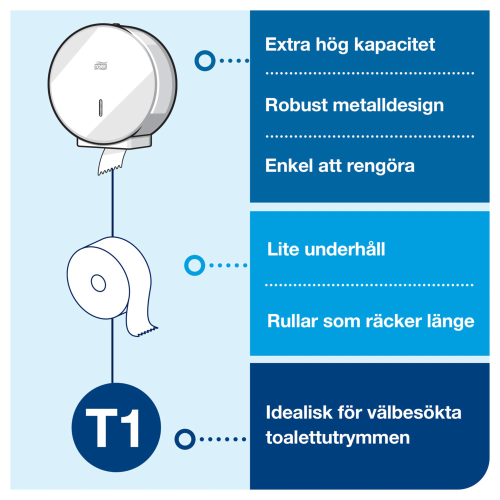 Torks slutna dispenser skyddar rullarna från smuts och stänk, och den höga kapaciteten gör att toalettpapper alltid finns tillgängligt, samt minskar behovet för påfyllning.