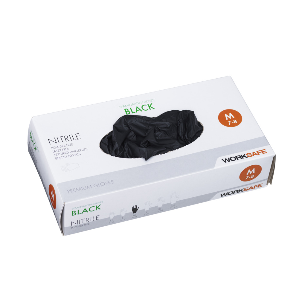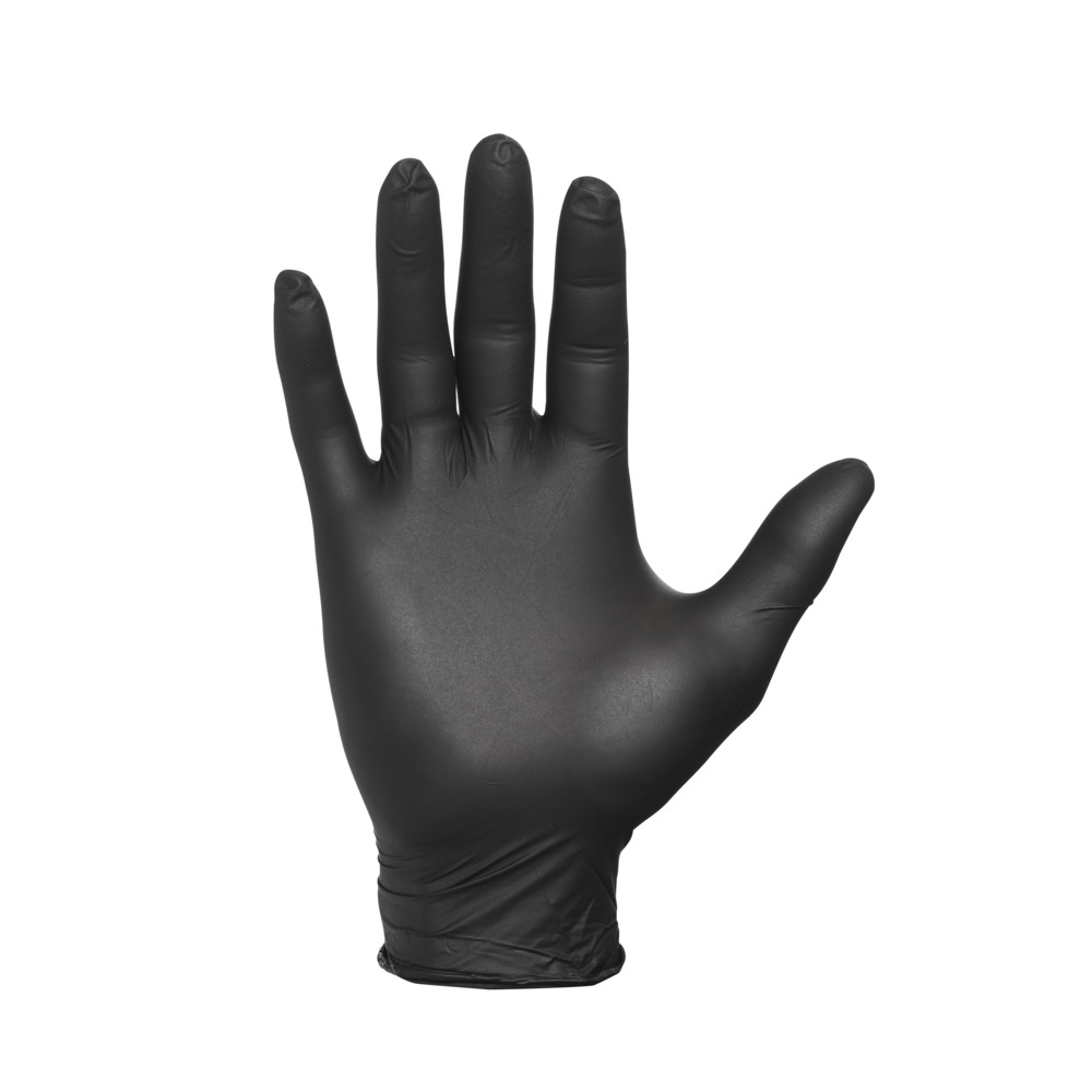 Svart engångshandske lämplig för användning inom daglig omvårdnad, användning inom sjukvård, vid provtagning, vid kontakt med blod och andra kroppsvätskor.