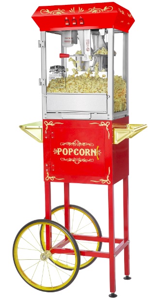 Popcornmaskinen kommer tillsammans med ställning på hjul.