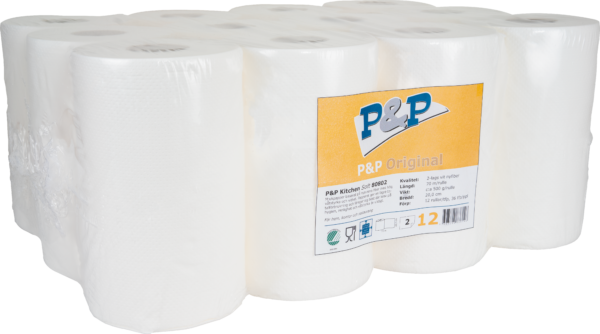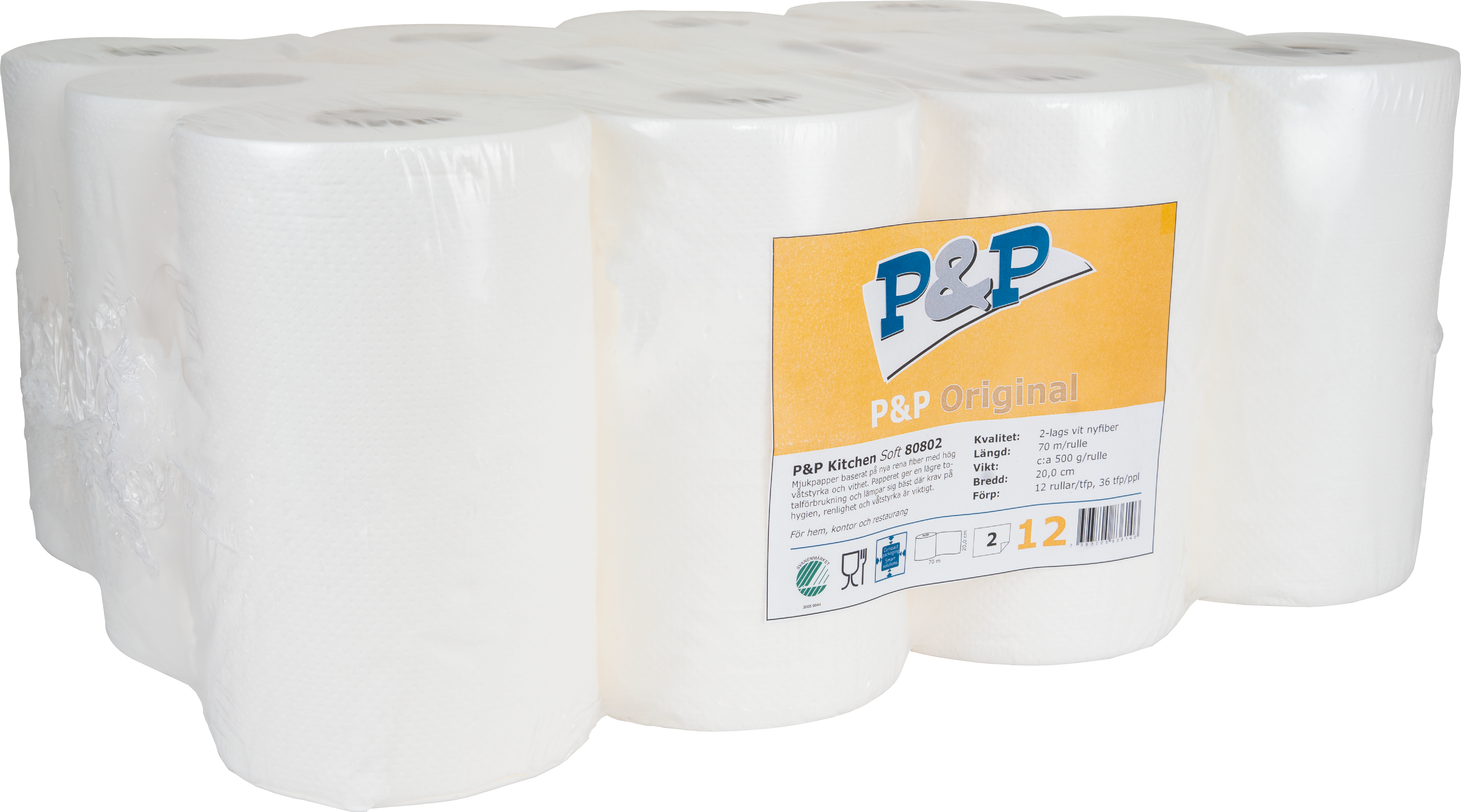 Hushållspapper Kitchen Soft P&P. 2-Lags Nyfiber, 200mm bredd, 12st Rullar/Frp