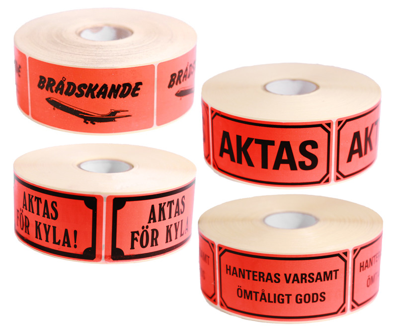 Fluorescerande självhäftande etikett med olika tryck. 1000 etiketter per rulle.